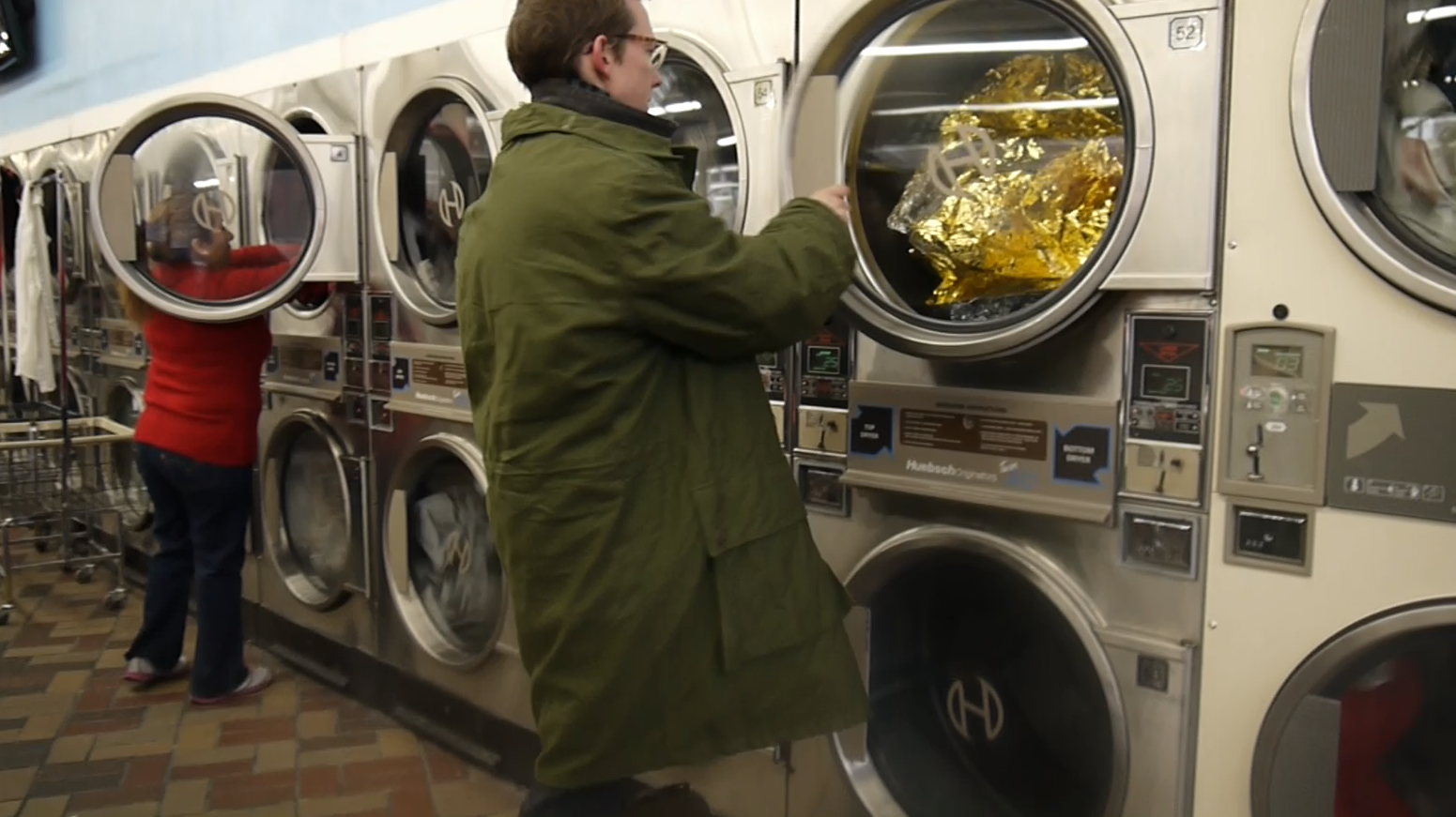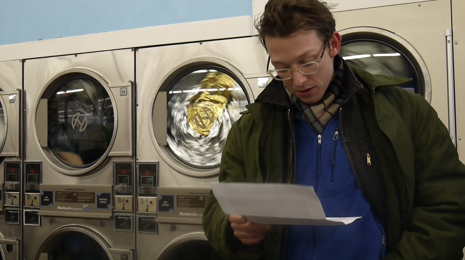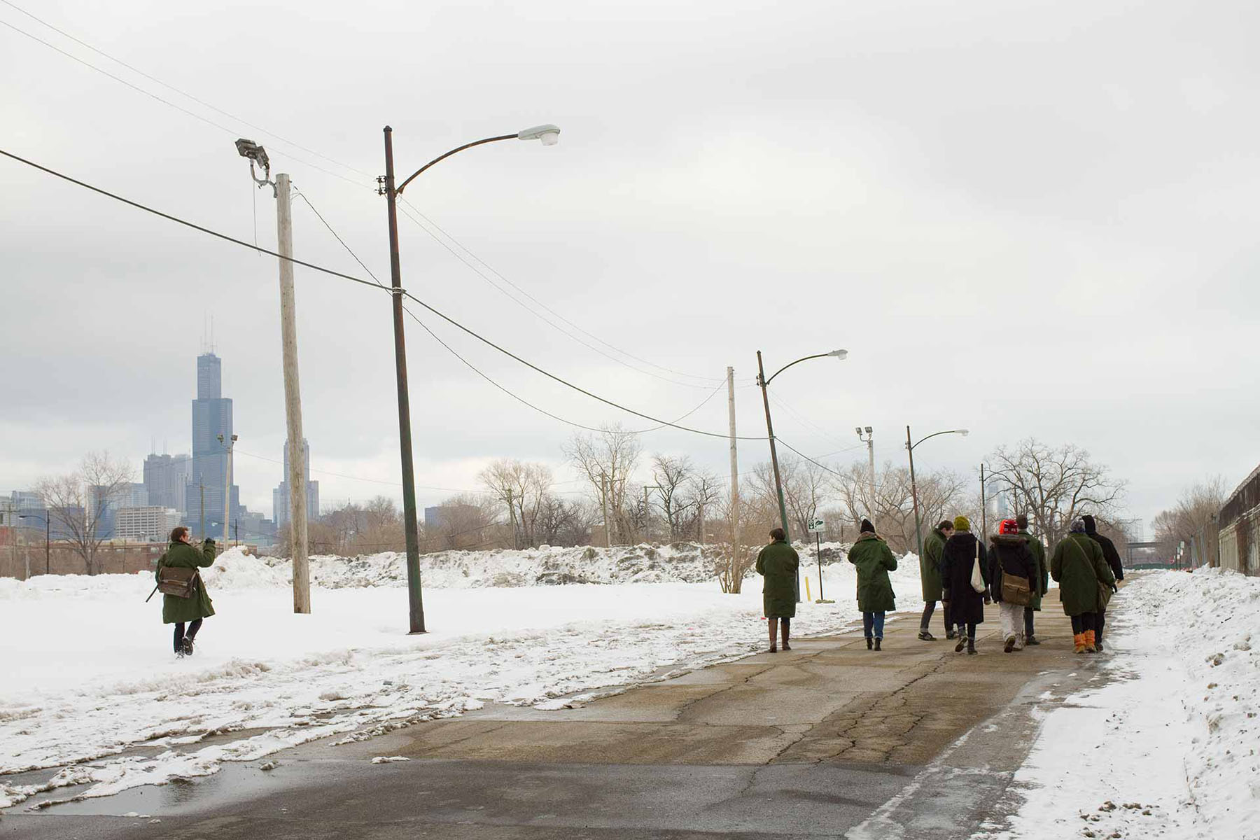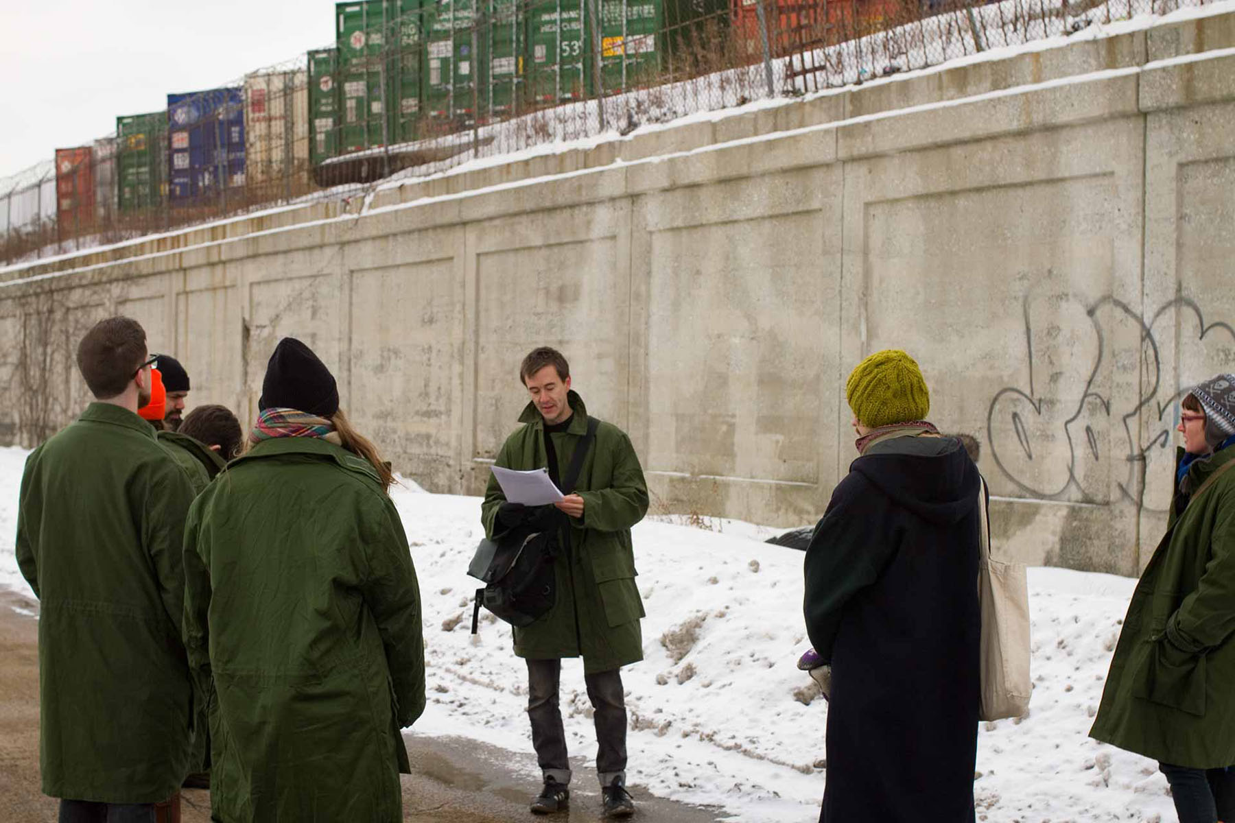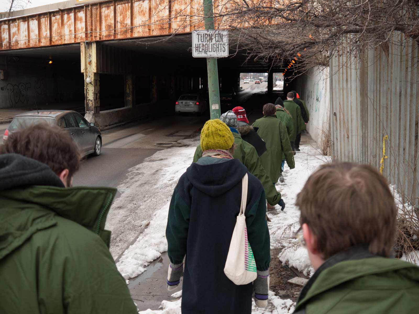 At the closing reception of their collaborative show whatever-is-not-here-present-to-our-senses-now, Philip Peters and David Rueter invited a number of artists to perform site-based readings. Each reader was asked to select a location within a 10-minute walk of the ACRE gallery. Between readings, attendees and readers walked from site to site. All were offered oversized Swedish army surplus coats for warmth, and were served hot drinks afterwards.Readers included Marissa Lee Benedict, Angharad Davies, Pat Elfritz, Sarah Knudtson, Alyssa Moxley, Philip Peters, and David Rueter.